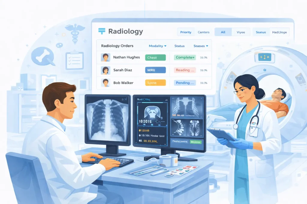 Automates imaging requests, technician scheduling, and digital report delivery.